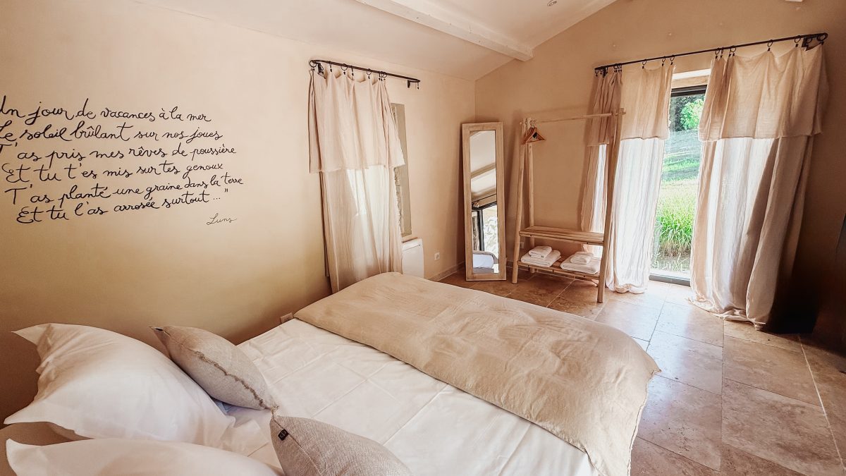 Totalement à l’écart du domaine, on y accède en traversant la prairie qui borde l’étang, les différentes restanques, le petit pont et enfin, la terrasse du SPA.