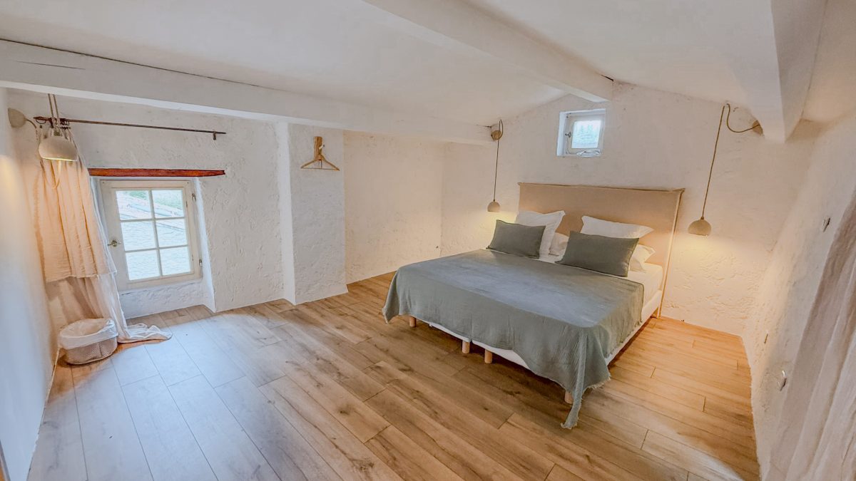 L’escalier est un peu étroit et la chambre est sous les toits : l’accès se fait par une porte un peu basse, il faudra baisser la tête pour entrer.